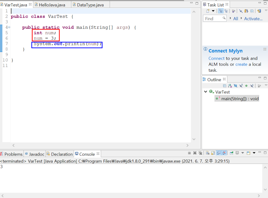 -> num이라는 이름으로 정수 3을 저장하는 메모리 공간을 할당한다는 뜻