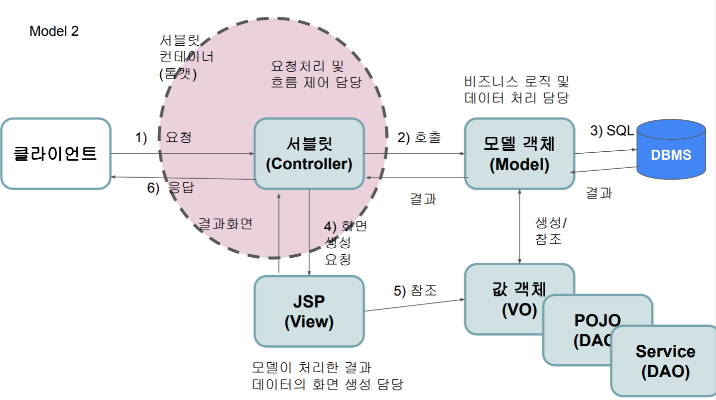 2)모델 2 : Controller 역할을 Servlet이 담당함.