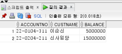 //두 번째 update문을 실행해 신사임당 계좌에 500만 원 입금함