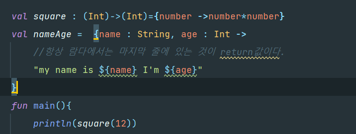 - 람다 함수는 항상 { }으로 감싸서 표현해야 한다.