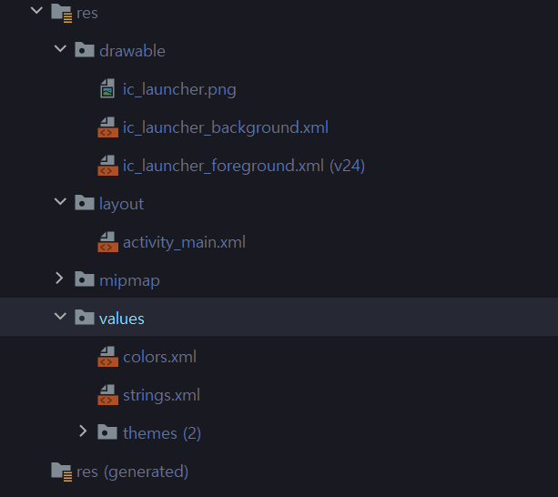 -values 폴더 : 문자열 구성하는 string.xml, 색상표 저장하는 colors.xml, 스타일 저장하는 themes.xml 등으로 구성되어 있음.