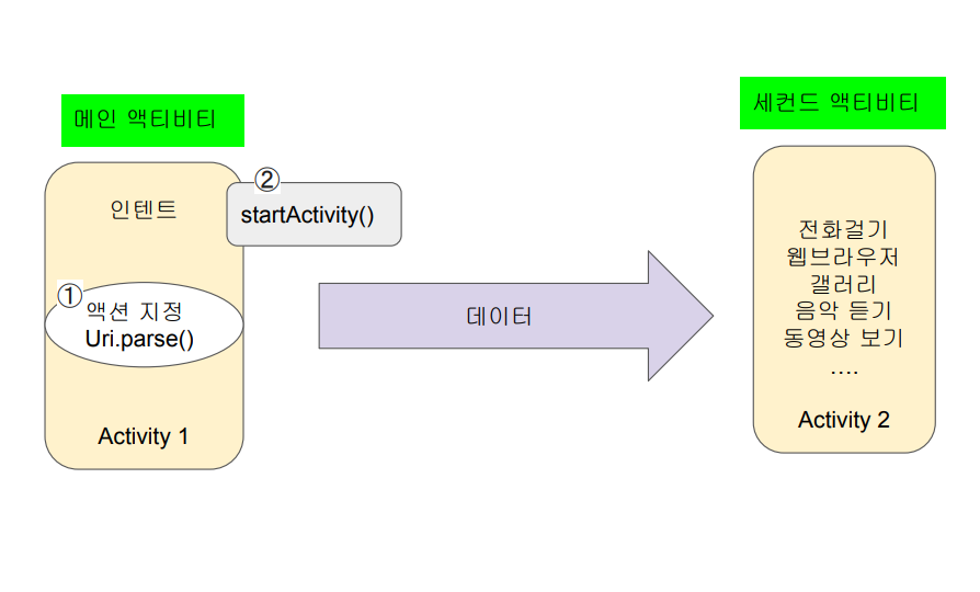 - 4) 약속된 액션(Action)을 지정하여 안드로이드에서 제공하는 기존 응용 프로그램을 실행하는 것