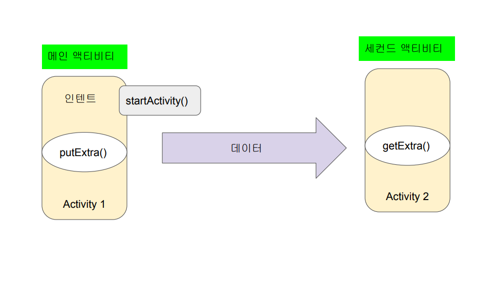 -메인 액티비티에서 인탠트에 데이터를 실어 넘긴 후, 세컨드 액티비티에서 받은 데이터 처리하는 방식(한쪽 방향)