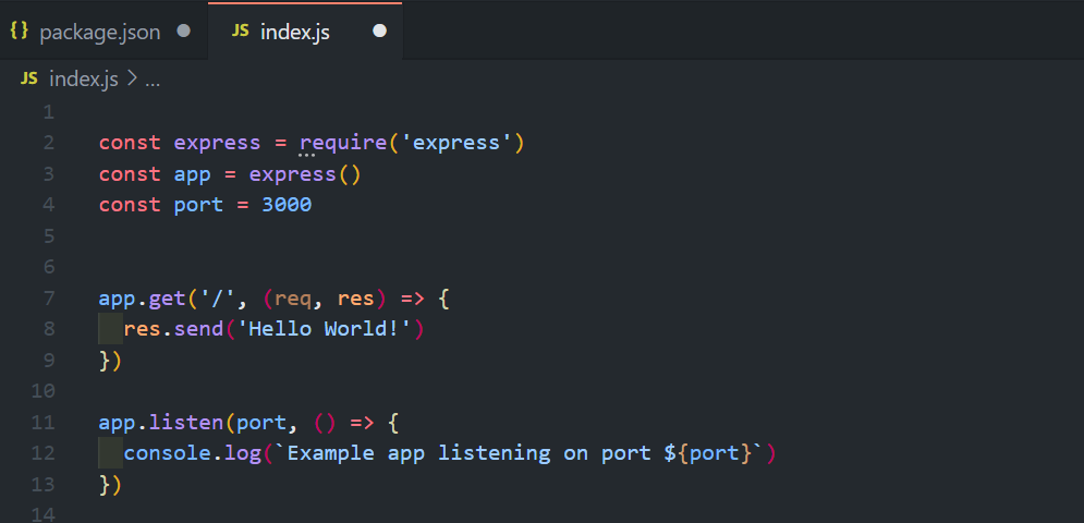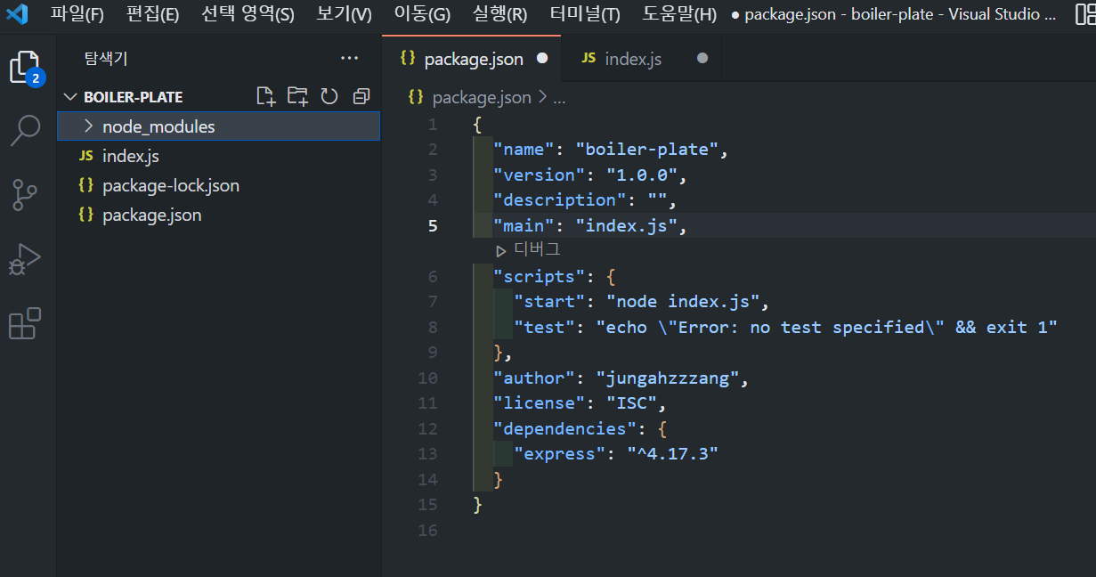 2. package.json 파일에 "start" : "node index.js" 추가 (시작점)