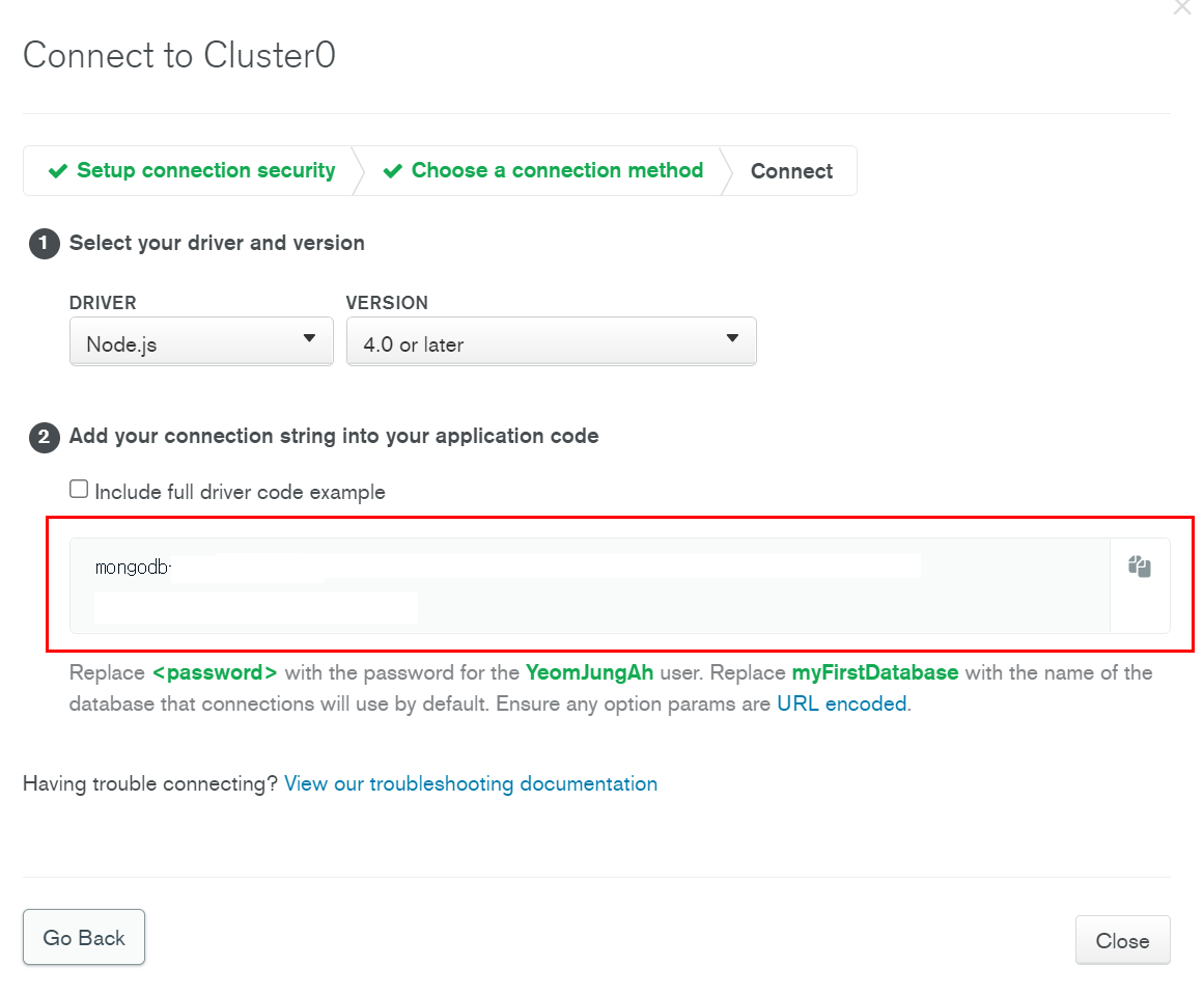 mongoose.connect('mongodb+srv://DB user이름:DB 비밀번호@cluster0.pihjw.mongodb.net/myFirstDatabase?retryWrites=true&w=majority', {