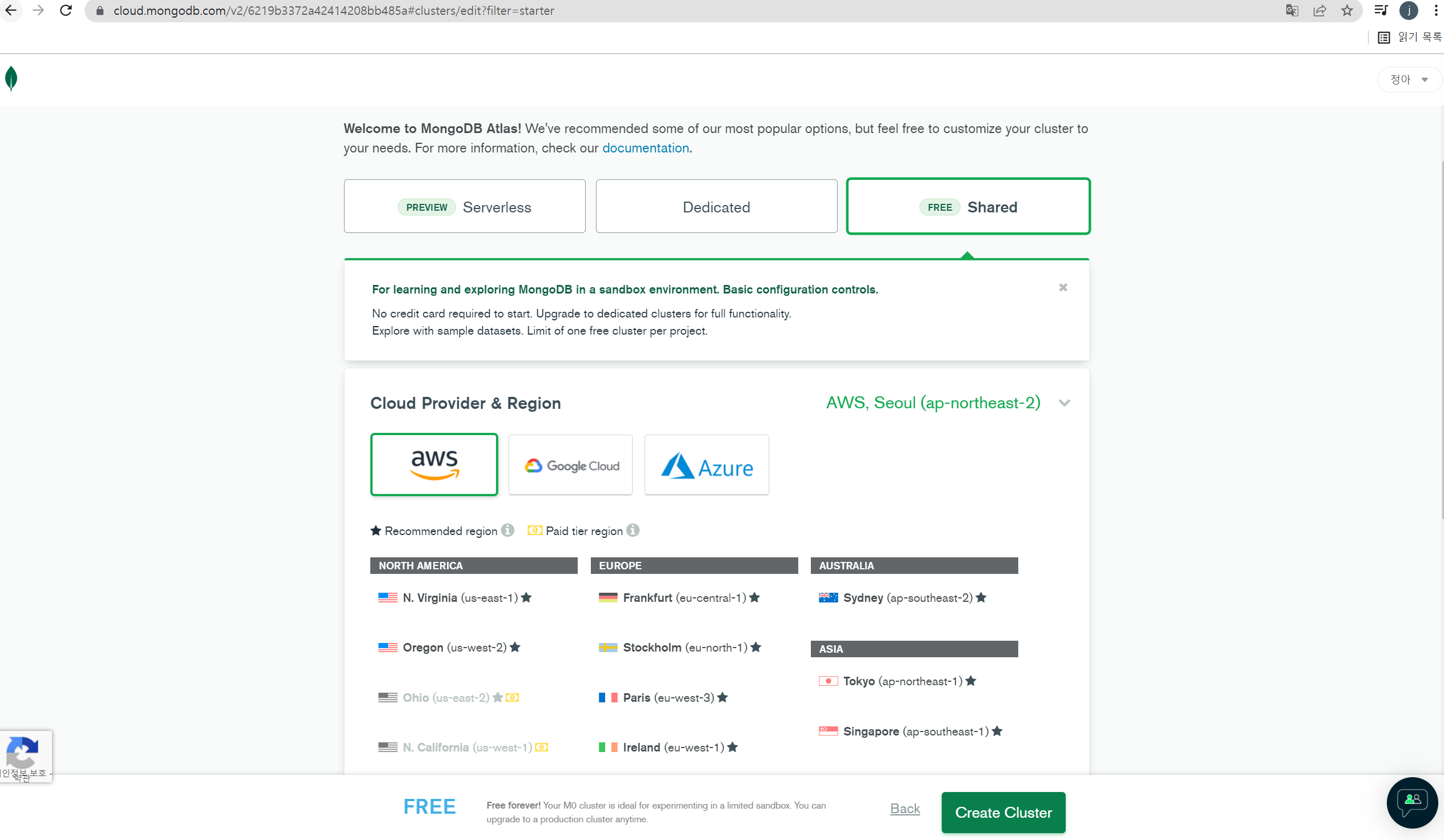4. aws, 가장 가까운 도시(필리핀)으로 선택하고 create해주면 끝.