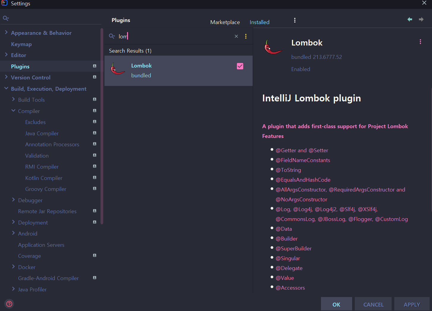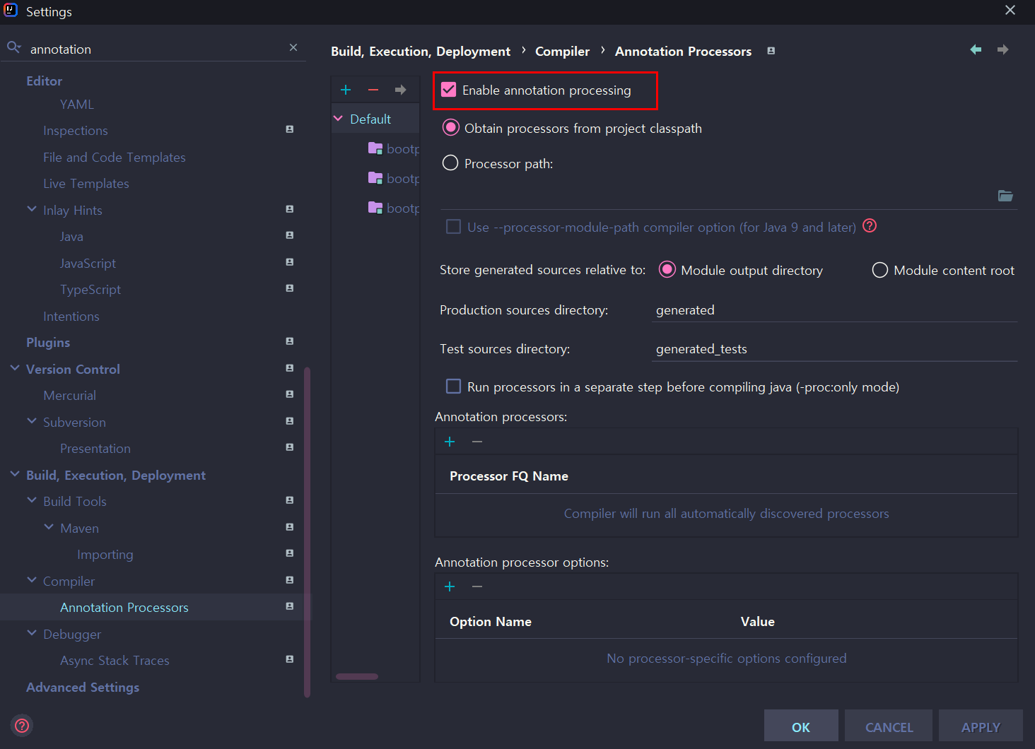 3. 롬복에 대한 설정 - settings - Annotation Processors - Enable annotation processing 체크