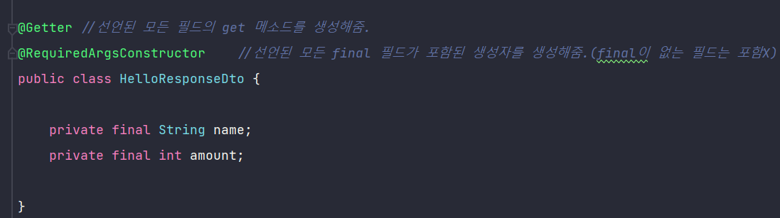 4. 앞서 작성한 코드를 롬복 코드로 변경하기 위한 HelloResponseDto 생성