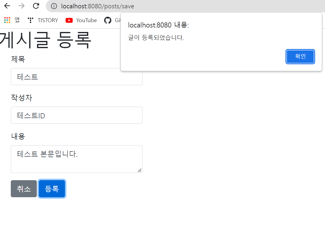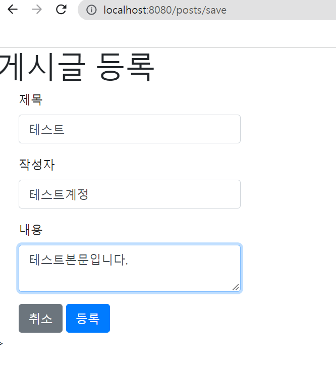 http://localhost:8080/ 으로 접근 후 글 등록 버튼 클릭 시 게시글 등록 페이지로 이동!