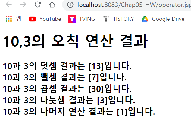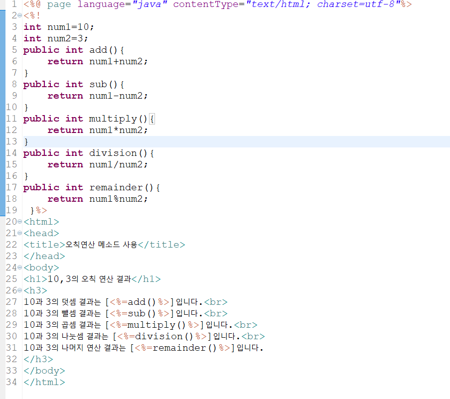 2. 한 개의 JSP 페이지 내 정수형 변수 num1, num2 두 개를 선언하고 두 개의 정수를