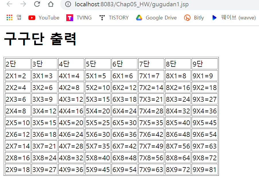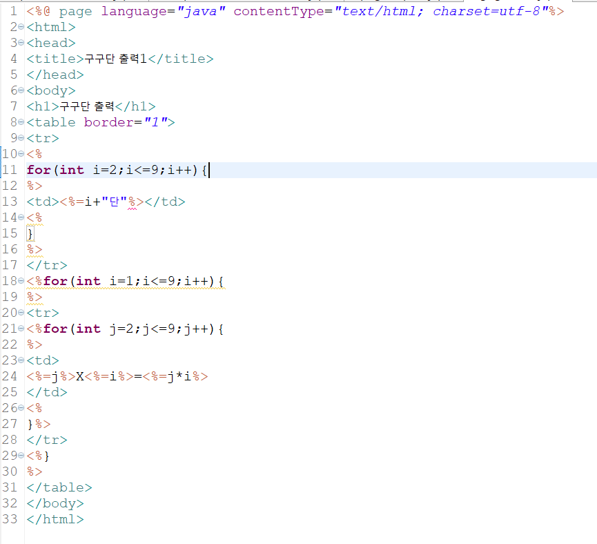 1. 스크립틀릿 내 반복문을 사용하여 구구단을 출력해 보자.