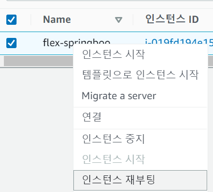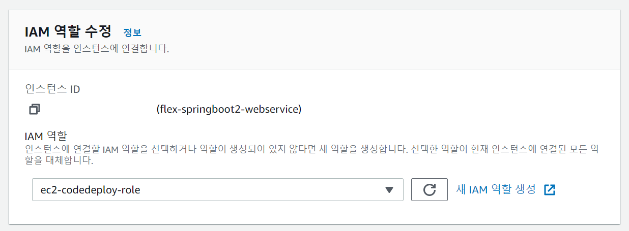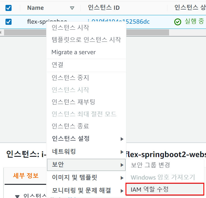 EC2 서비스에 등록하기 위해 인스턴스 설정->IAM 역할 연결/바꾸기 선택