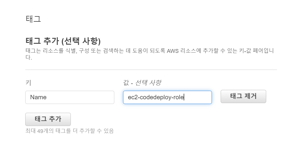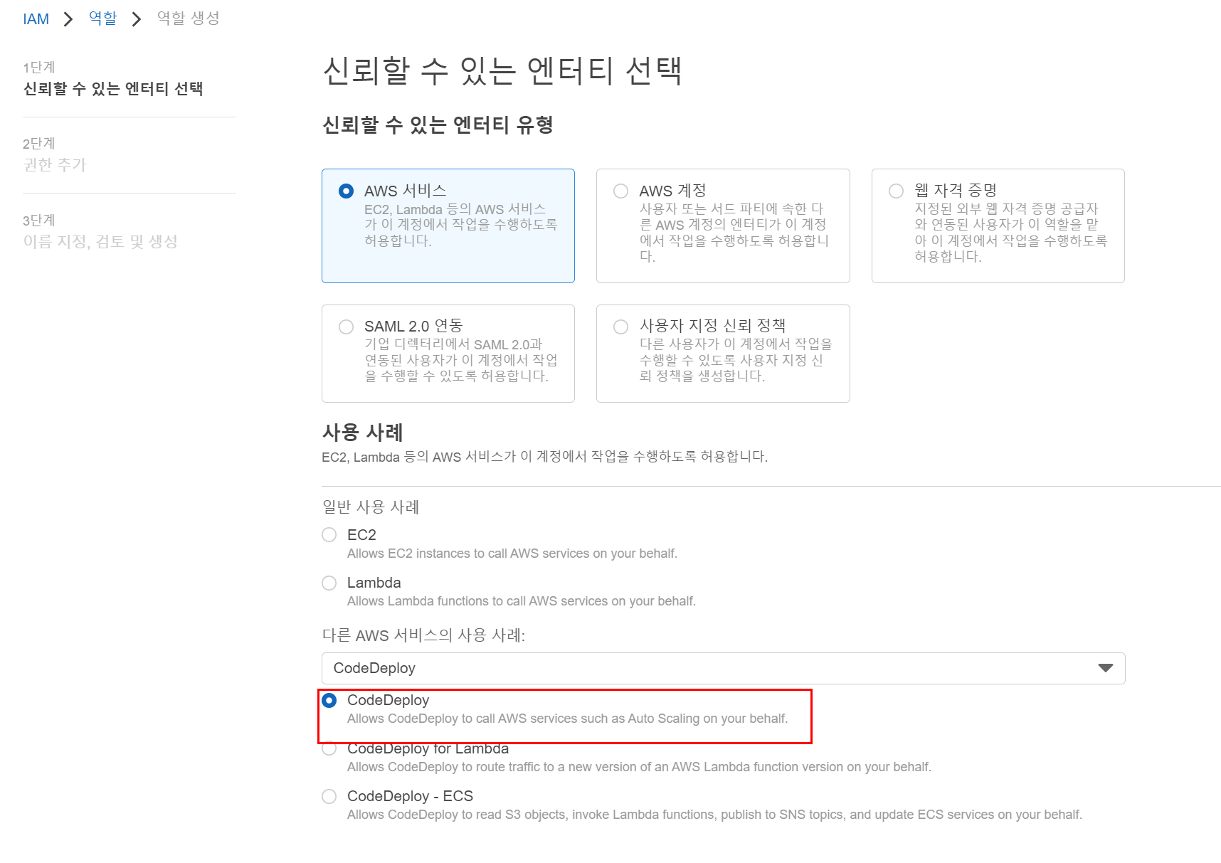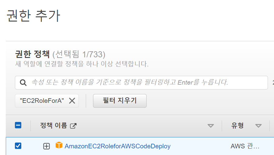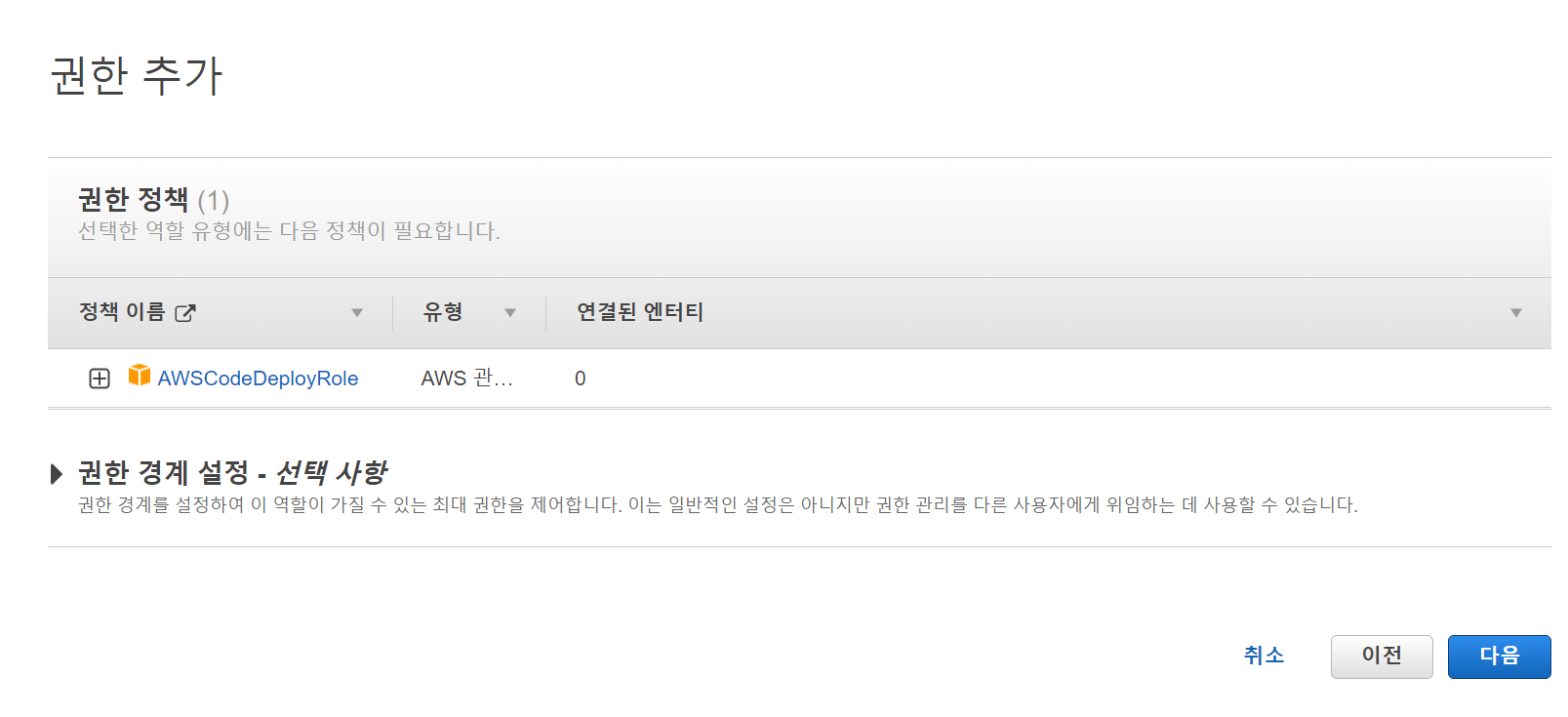 CodeDeploy는 권한이 하나 뿐이라 선택 없이 바로 다음으로 넘어가면 된다.