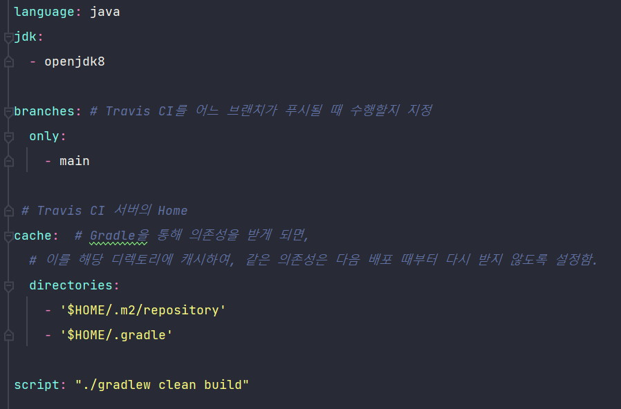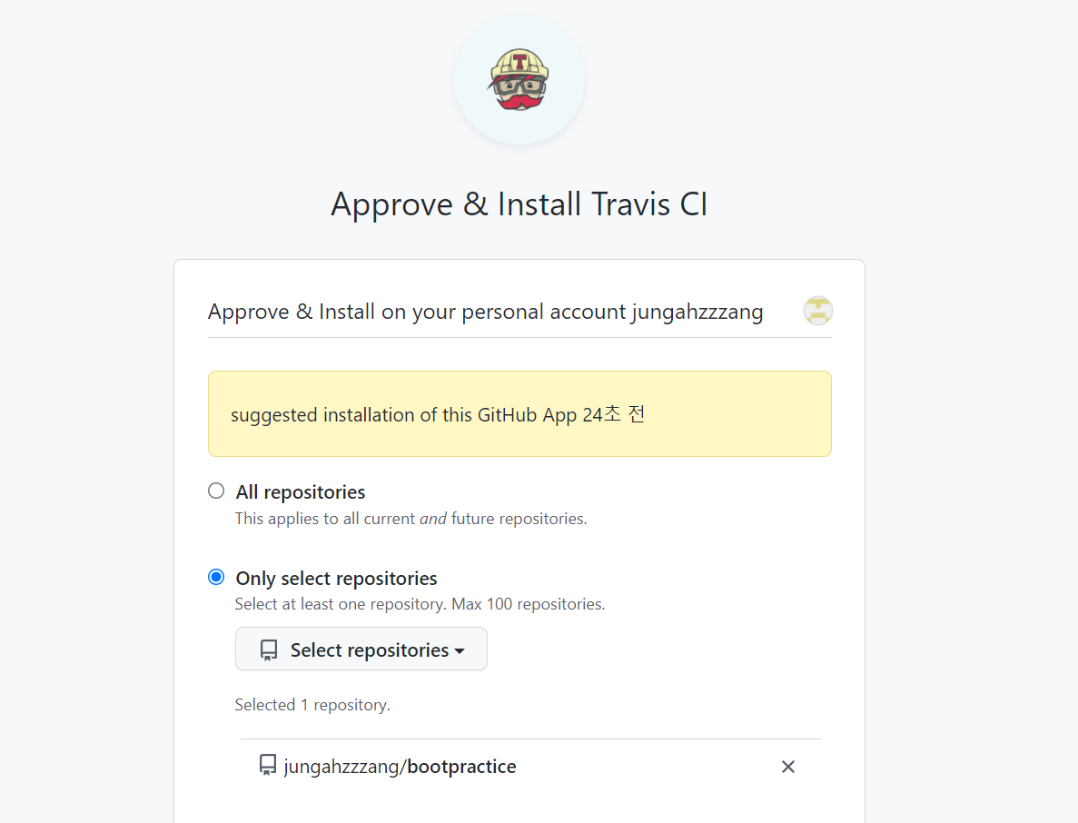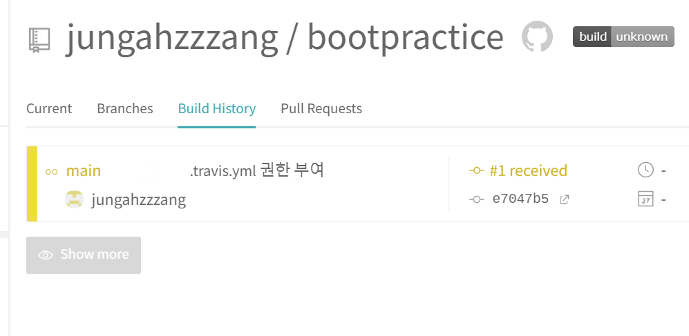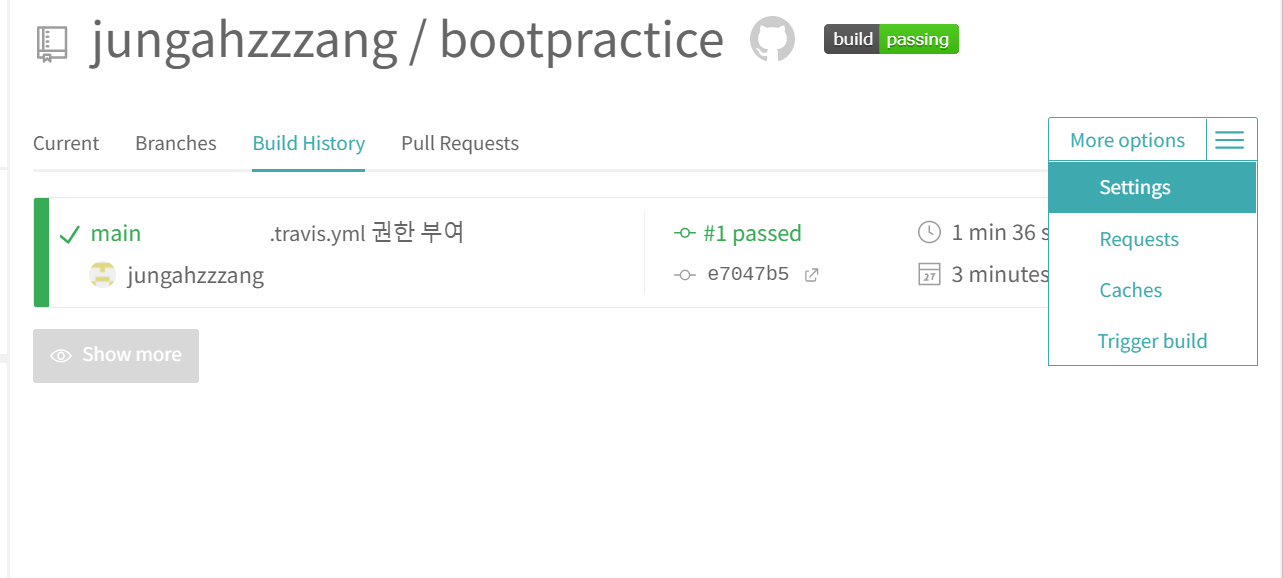 yml 파일 작성 후 깃허브 커밋하고 Travis CI 저장소 페이지 확인해 보면 빌드 성공이 뜬다.