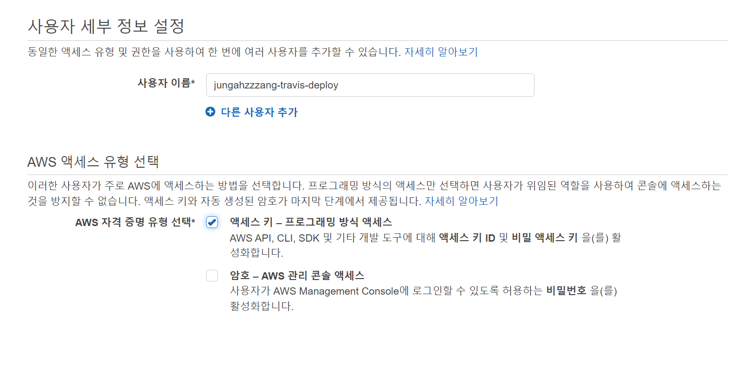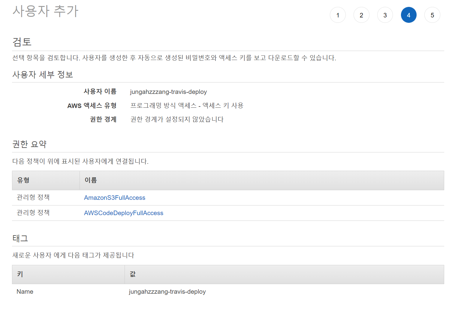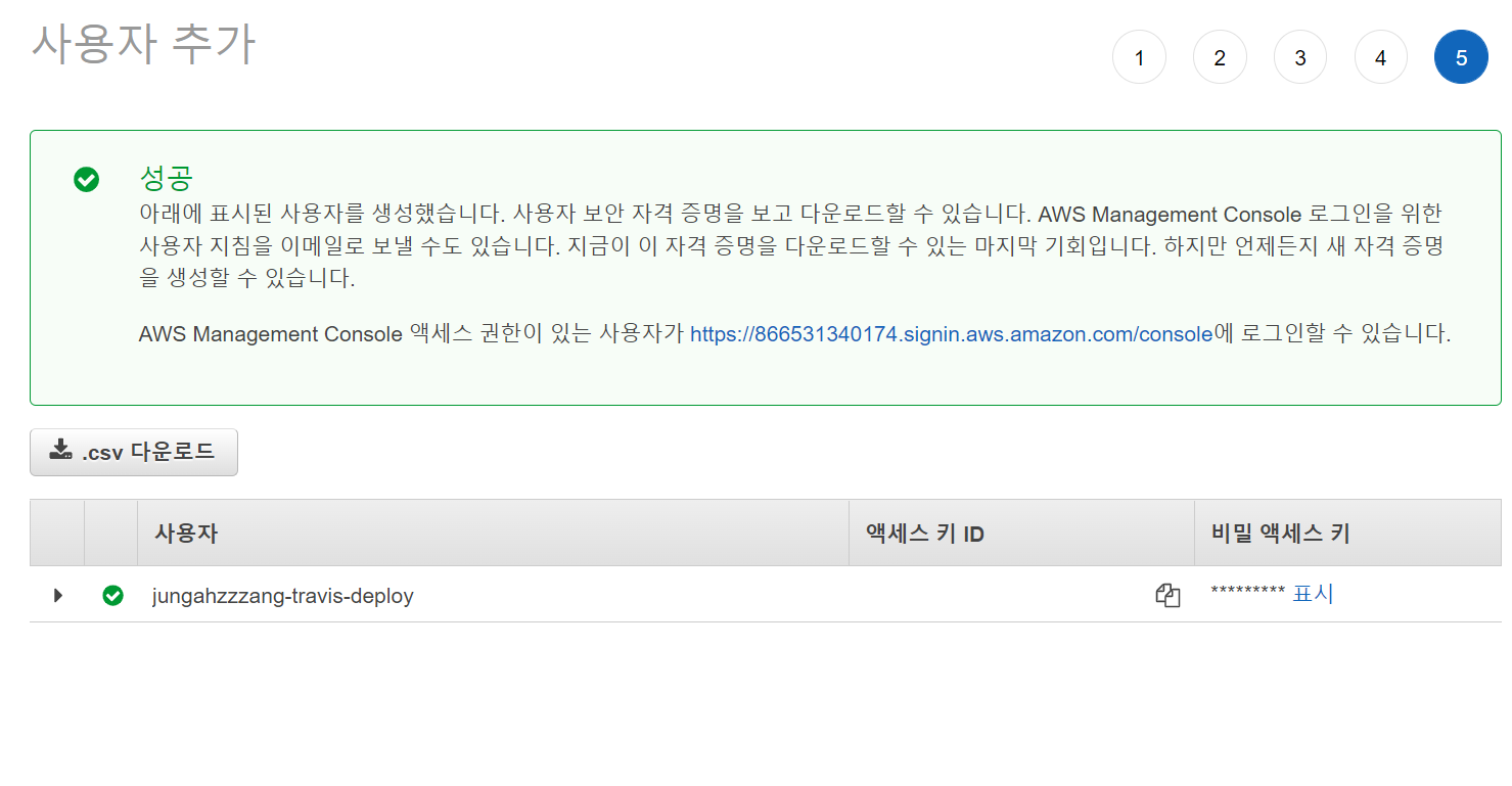Travis CI에서 사용될 엑세스키, 비밀 엑세스 키가 생성되었다.
