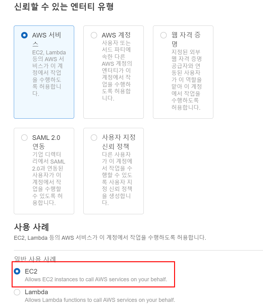 - 역할 : AWS 서비스에만 할당할 수 있는 권한(EC2,CodeDeploy,SQS 등)