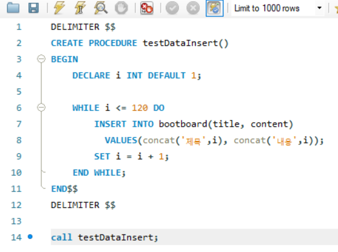 그전에 먼저 게시글이 여러 개가 존재해야 목록을 출력할 수 있으므로 테스트 데이터 프로시저를 생성하여 게시글 120개를 등록해 준다.