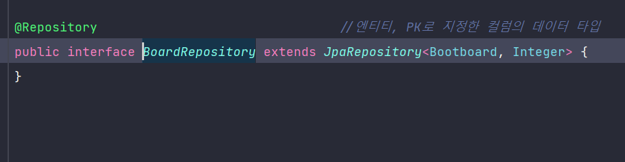 - Entity에 의해 생성된 DB에 접근하는 메서드 (EX. findAll()...)들을 사용하기 위한 인터페이스, 위에서 엔티티를 선언함으로써 데이터베이스 구조를 만들었다면 여기에 어떤 값을 넣거나 넣어진 값을 조회하는 등의 CRUD를 해야 쓸모가 있는데 이것을 어떻게 할 것인지 정의하는 기능을 한다고 생각하면 된다.