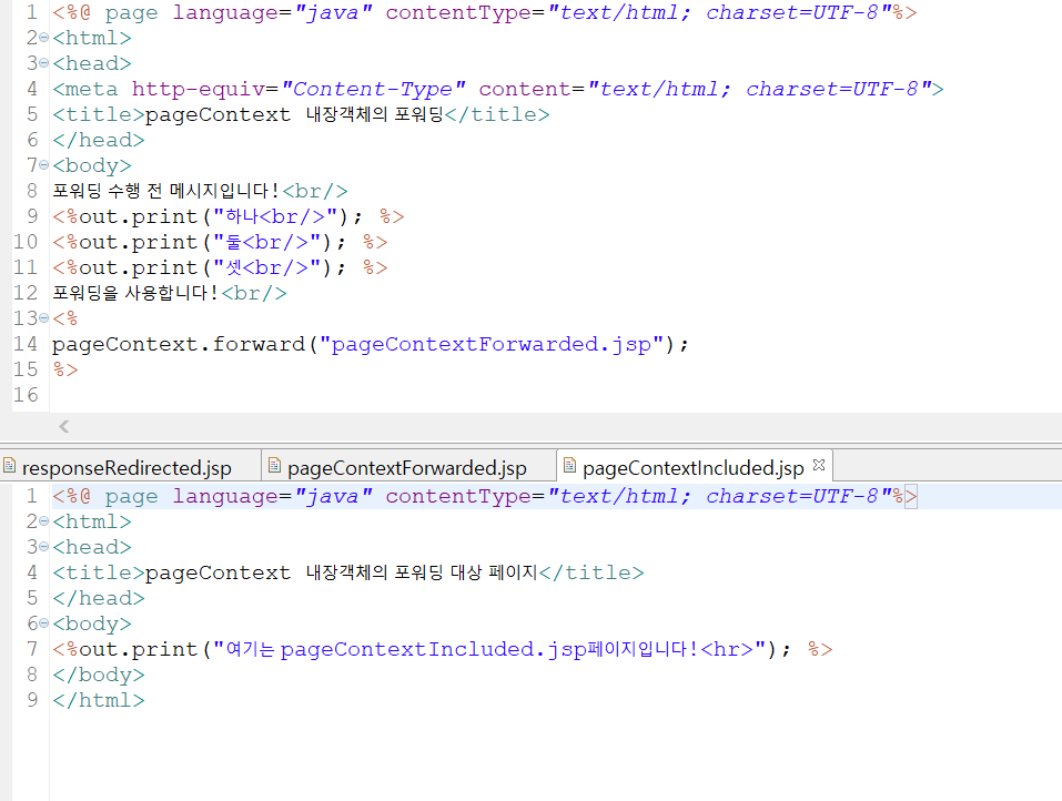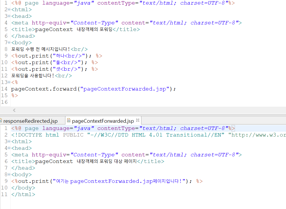 포워딩 방식은 response 내장객체의 Redirect방식처럼 다른 웹페이지로의 이동에 관련된 방식이다.