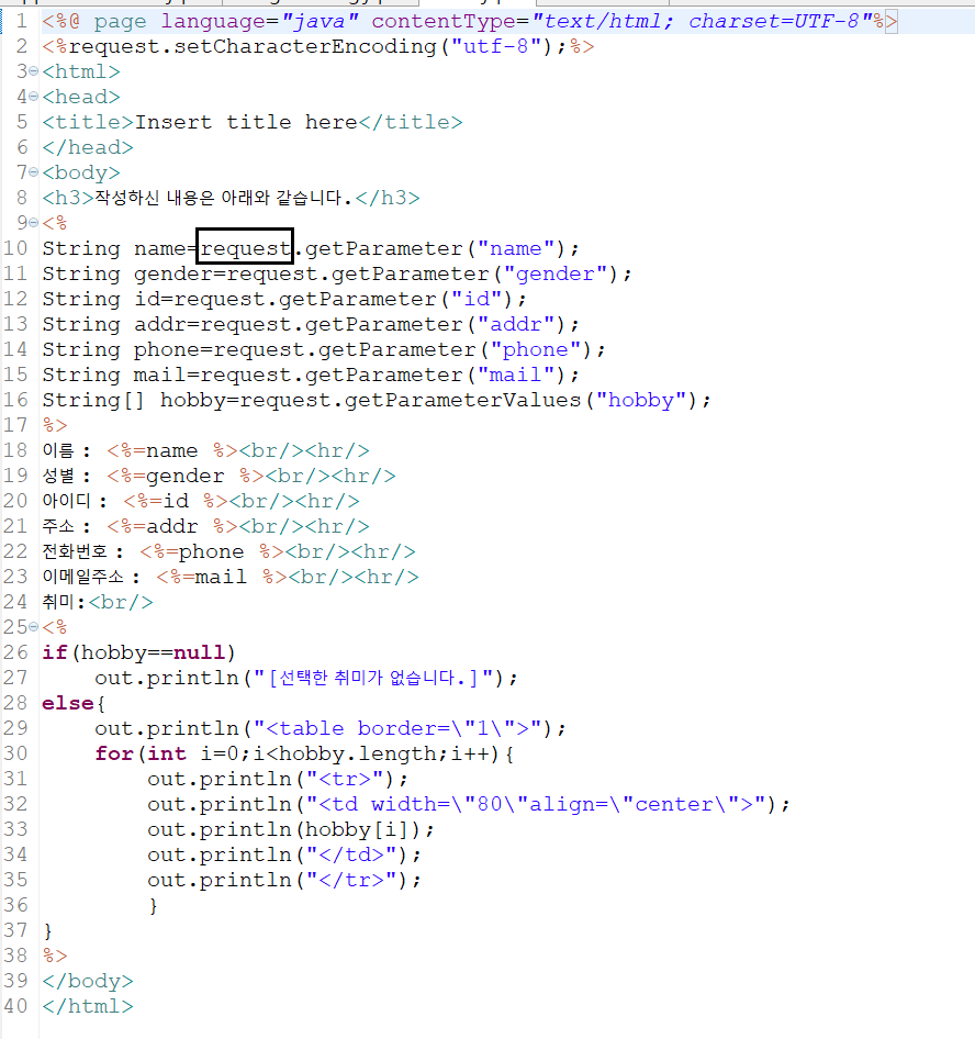 | JSP 공부 기록(2)-구구단 테이블,현재 날짜와 시간, 오칙 연산 예제 (0) | 2021.08.14 |