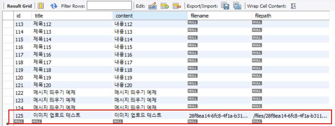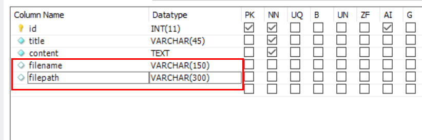 맨 처음으로 DB 테이블에 업로드된 파일 이미지, 파일 경로를 저장할 수 있도록 컬럼을 추가해 준다.