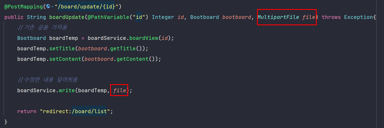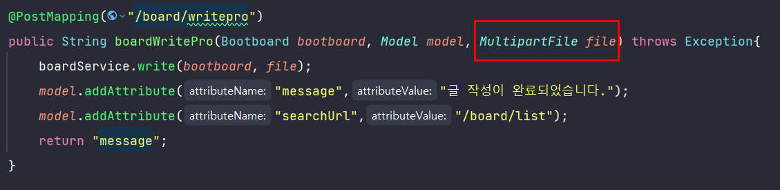 컨트롤러 코드 수정(매개변수에 MultipartFile 추가)