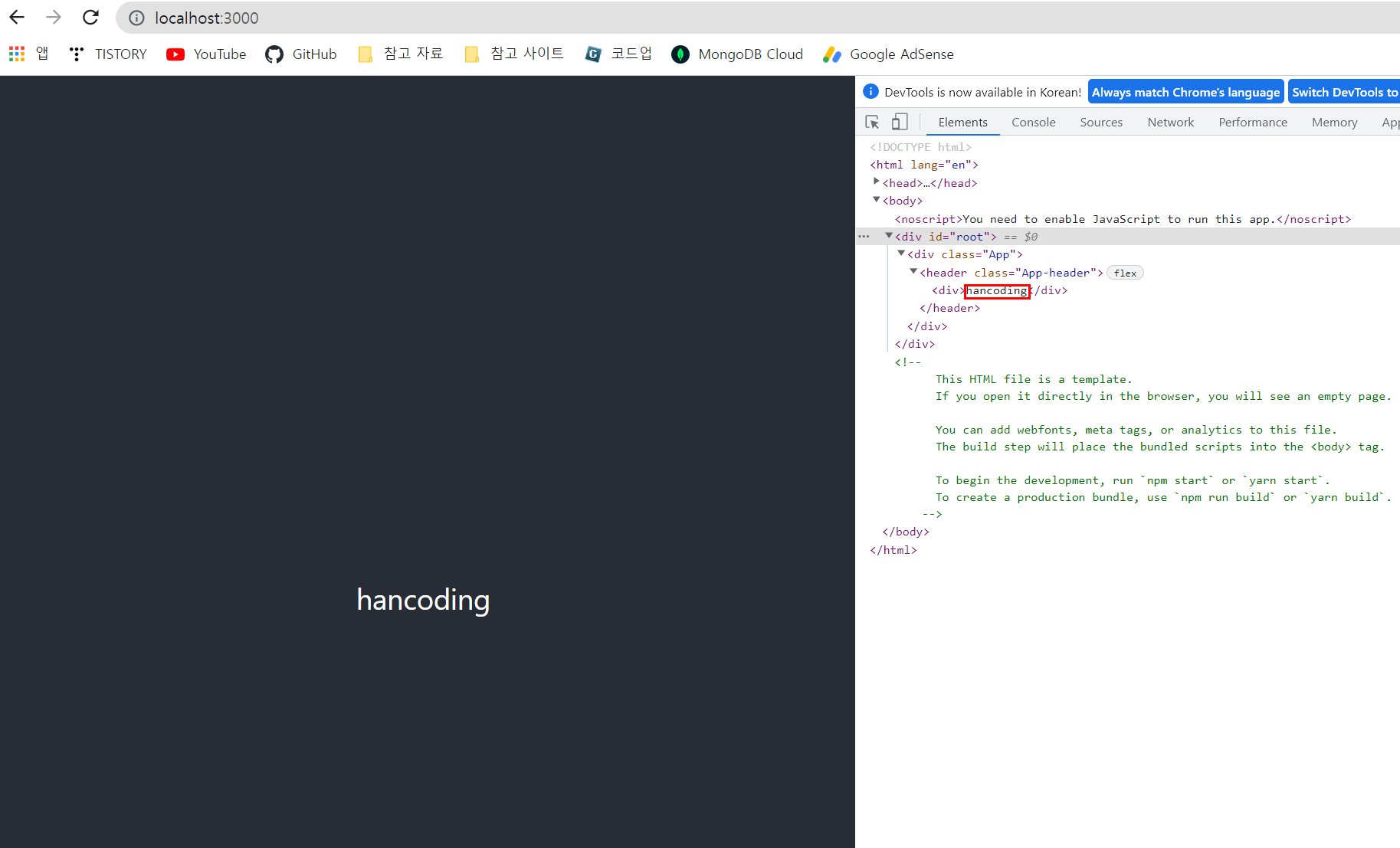 실제 크롬에서 확인해 봐도 <div>태그 안에 hancoding이 들어간 것을 확인할 수 있다.