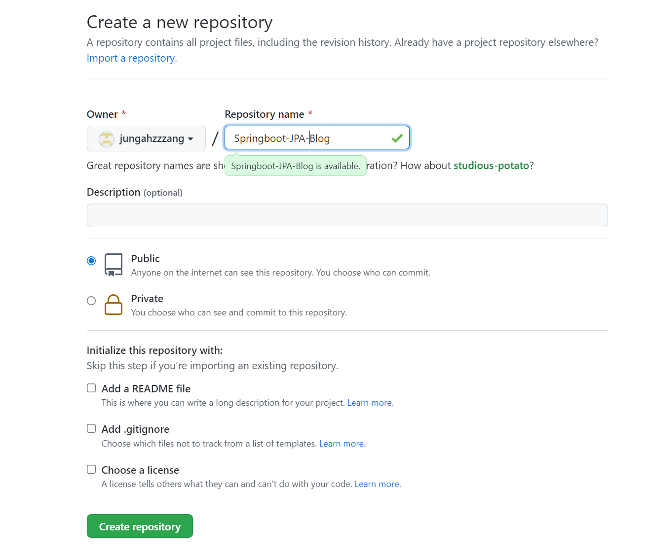 깃허브에 저장소를 새로 만들어주고