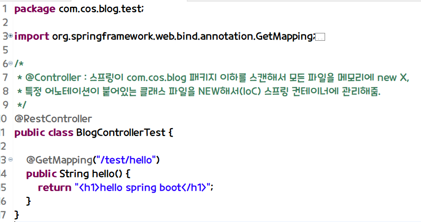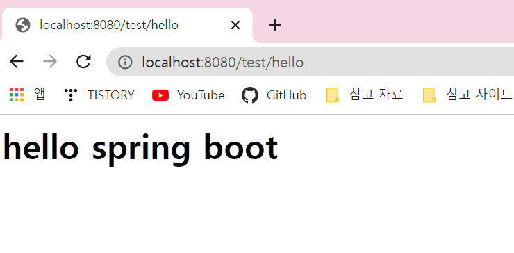 위에 @GetMapping 어노테이션으로 매핑해둔 주소인 http://localhost:8080/test/hello에 접속하면 아래와 같은 화면이 뜬다!!
