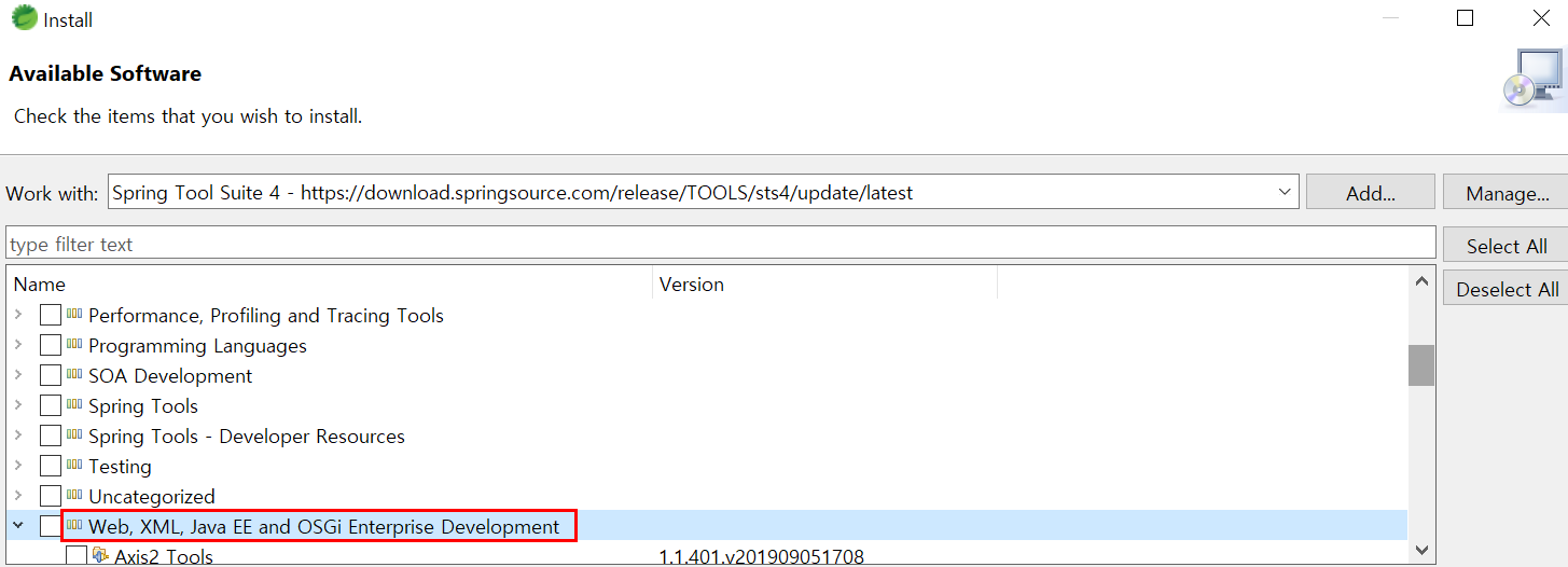 그리고 STS 4버전에서 JAVA EE 웹 개발을 하려면 따로 설치해야 JAVA EE Tool이 있다.