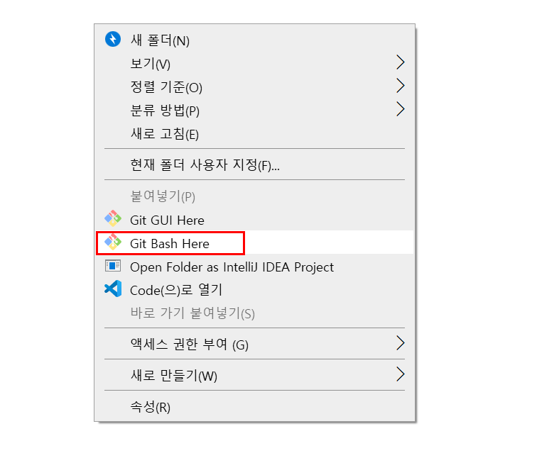 먼저 Git 을 설치하고 프로젝트 폴더에 우클릭해서 Git Bash Here를 선택하면