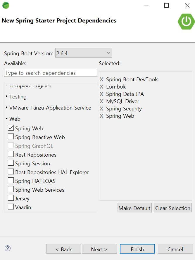 의존성은 Spring Boot DevTools, Lombok, Spring Data JPA, MySQL Driver, Spring Security, Spring Web 총 6가지를 추가해준다.
