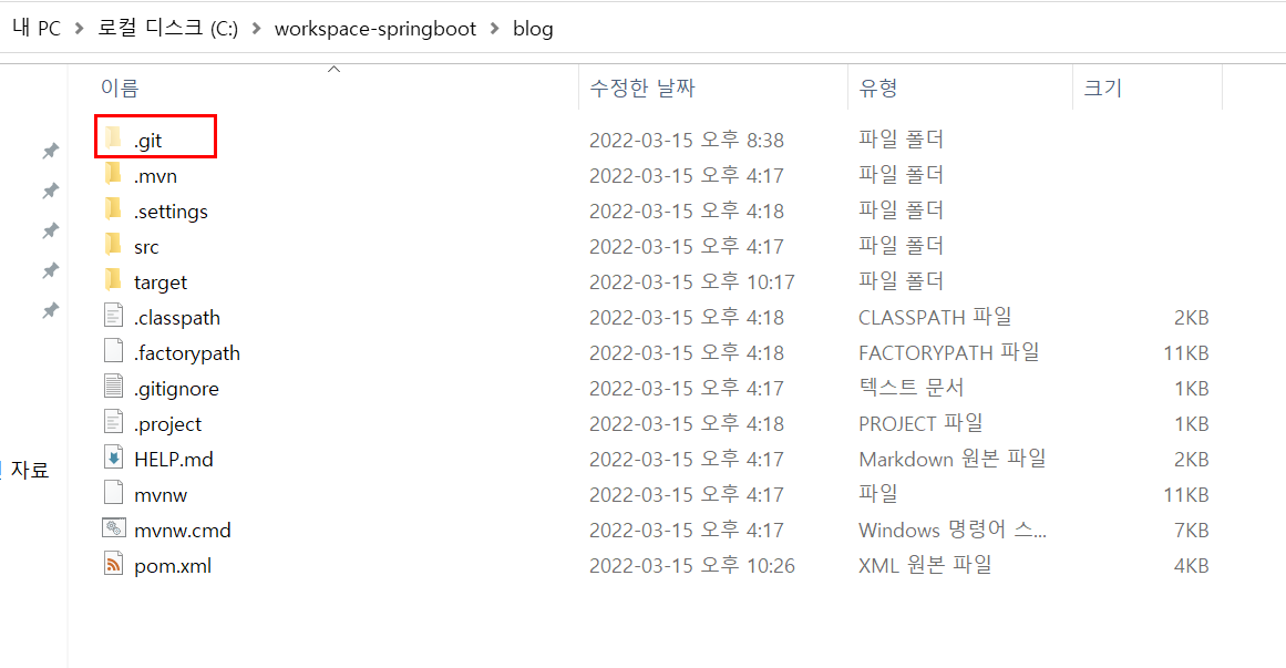 이렇게 .git 폴더가 생기면서 깃 저장소가 생긴다.