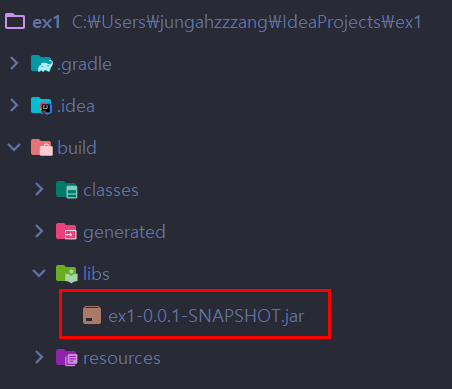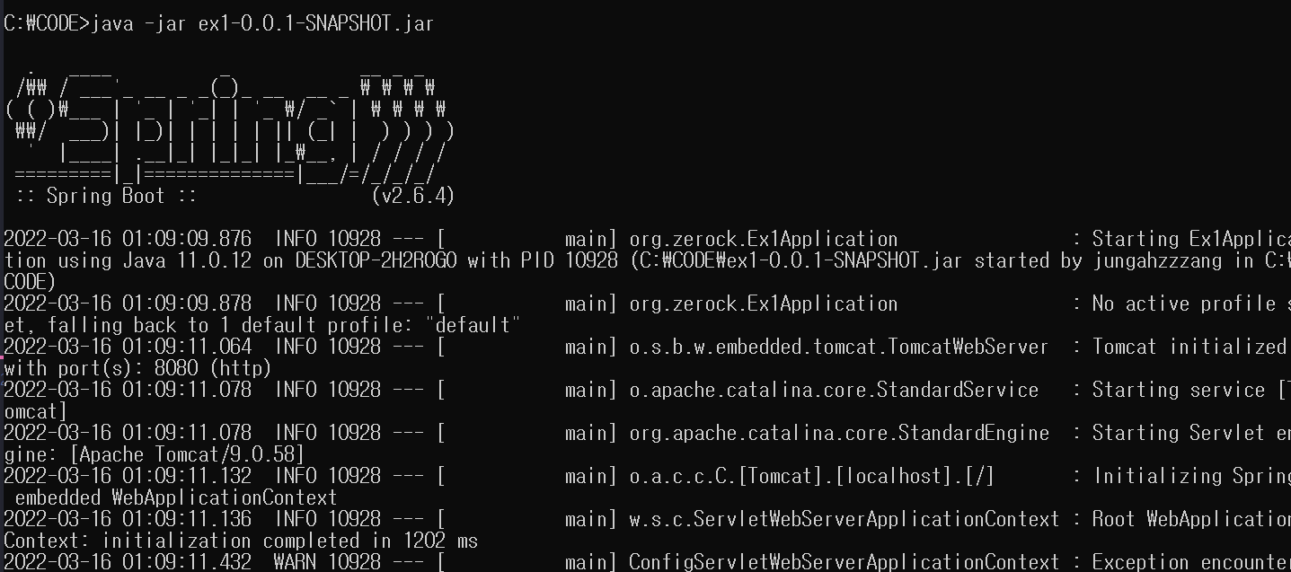 java -jar ex1-0.0.1-SNAPSHOT.jar //jar 파일 실행 명령어