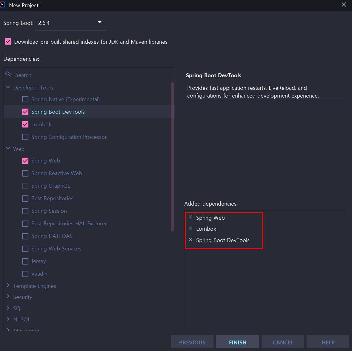 - 의존성은 Spring Web, Lombok, Spring Boot DevTools 3가지 추가