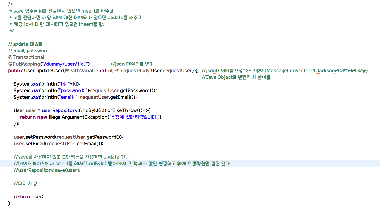 - 그렇기 때문에 우리는 save 함수를 사용하지 않고 더티체킹을 활용할 것이다.