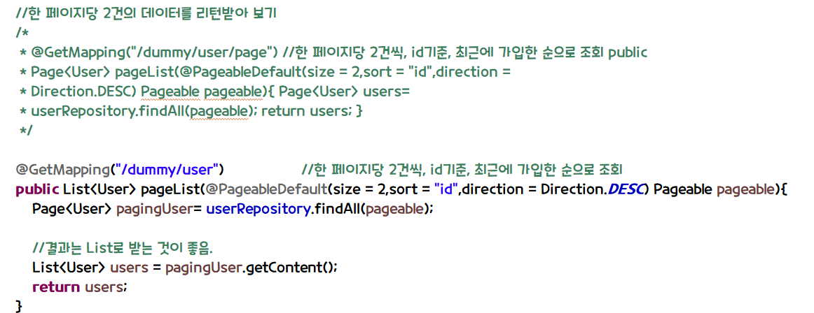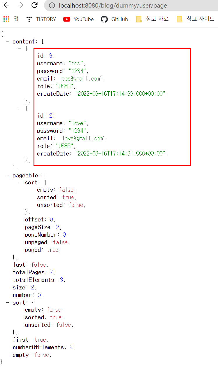 한 페이지에 2명의 유저만 조회되는 것을 확인할 수 있다.