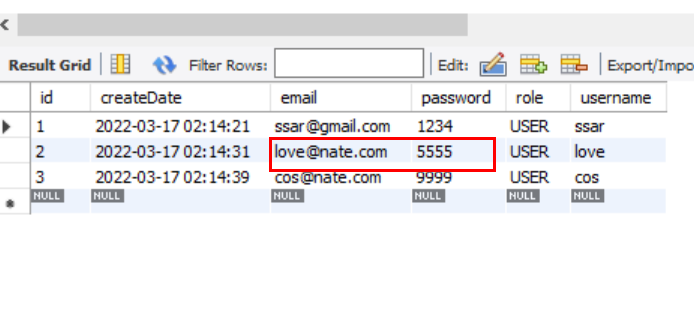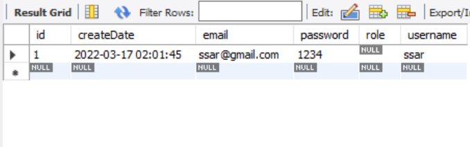 - DB에도 INSERT가 잘 되었지만 여기서 role 컬럼이 문제이다.