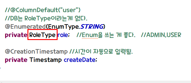 - DB에는 RoleType이라는게 없으므로 @Enumerated(EnumType.STRING)을 선언해준다.