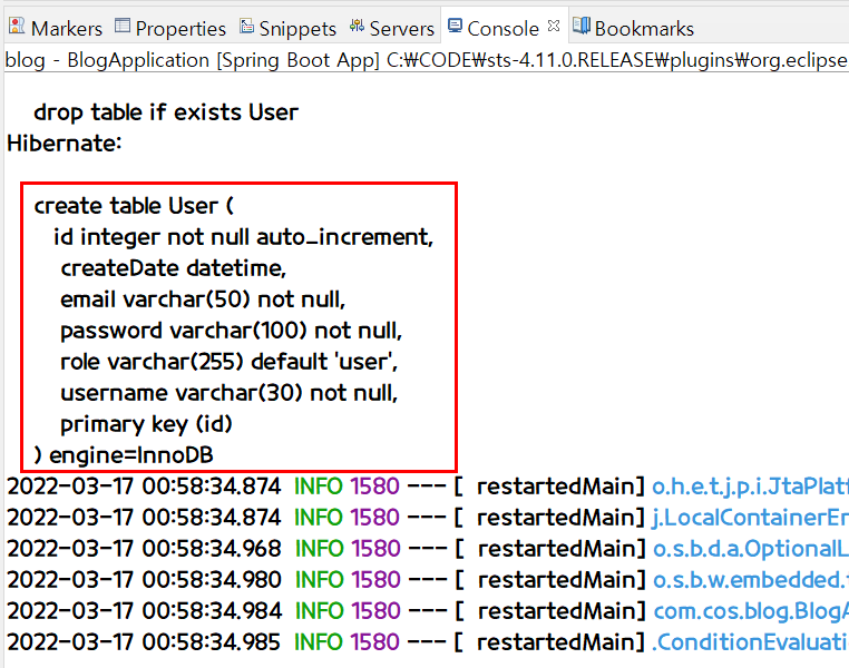 실행하면 아래와 같이 콘솔창에 create문이 생기면서 MySQL에 테이블이 생긴다.
