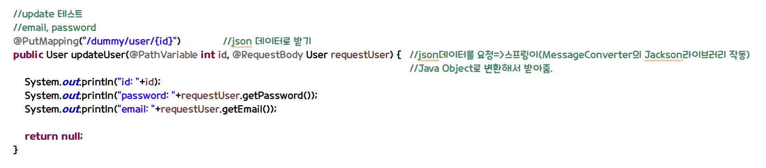 - json 데이터 요청 -> 스프링이 (MessageConverter의 Jackson 라이브러리 작동) Java Object로 변환해서 받아줌.