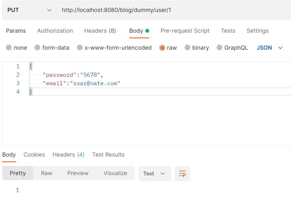 1번 유저의 비밀번호와, 이메일을 아래와 같이 수정해준다.
