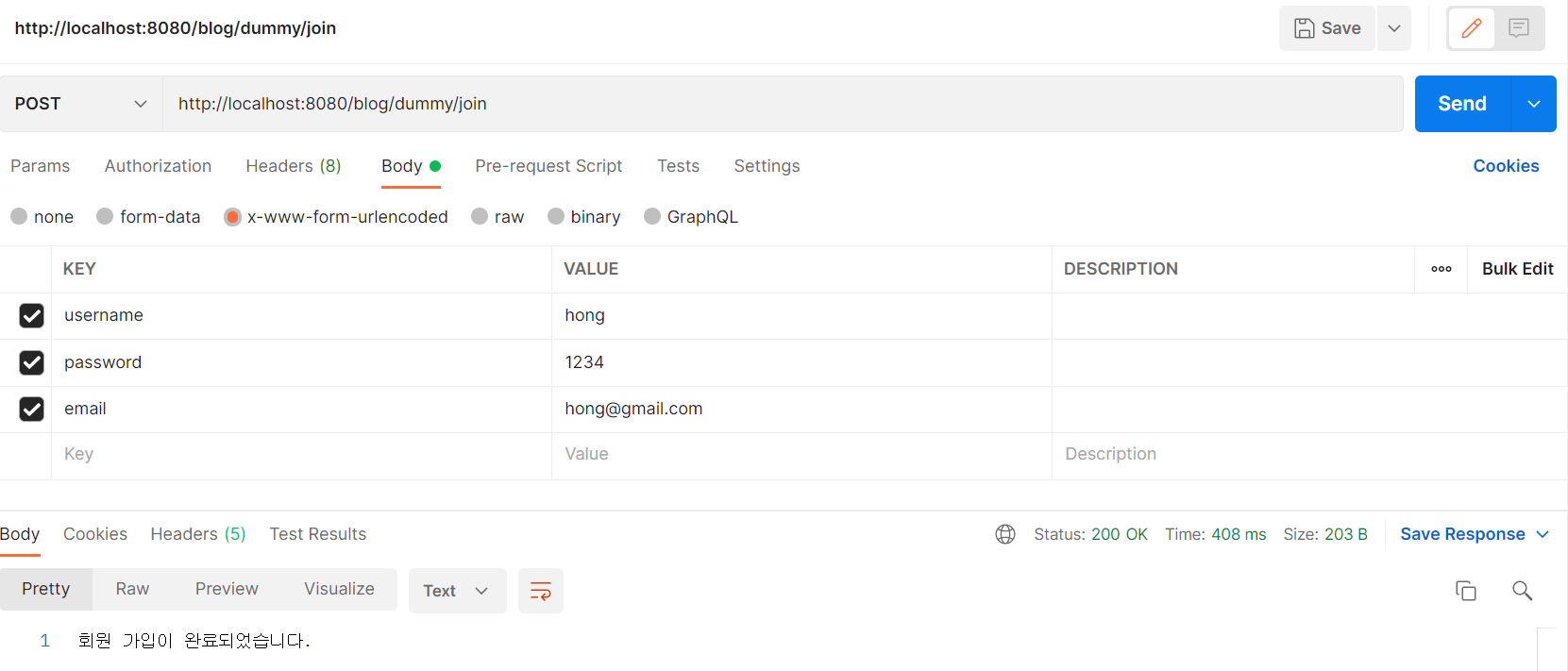 Post매핑이기 때문에 Postman을 사용해서 회원가입 테스트를 진행해 본다.