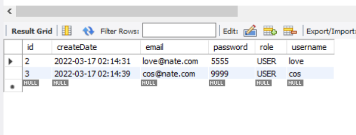 - 테이블 생성 시 role 의 DefaultColumn값을 "USER"로 주었지만 이 개념은 아래와 같이 role을 제외하고 insert 시에만 적용된다.