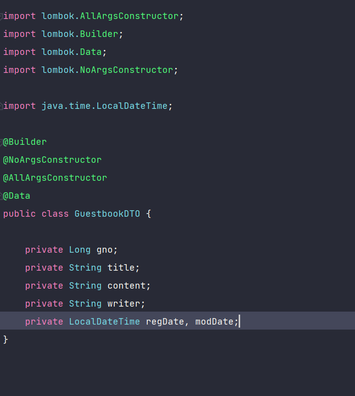 Guestbook guestbook = Guestbook.builder().title("Title..."+i).content("Content..."+i).writer("user..."+(i%10)).build();