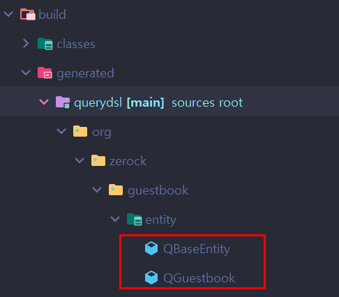 여기까지 설정하고 build 항목에서 compileQuerydsl을 실행하면 build 폴더 안에 Q로 시작하고 이후는 엔티티 클래스의 이름과 동일한 클래스가 생성됨.