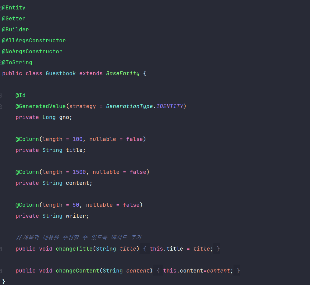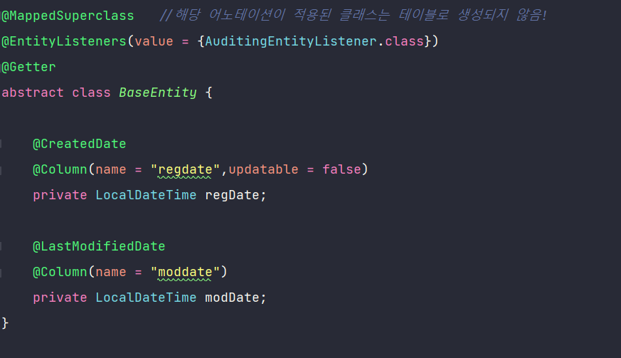 - 게시글 작성, 수정 시간 같이 자동으로 추가되고 변경되어야 하는 컬럼을 매번 처리하는 일은 번거롭기 때문에 자동으로 처리 가능한 어노테이션을 이용해서 설정한다.