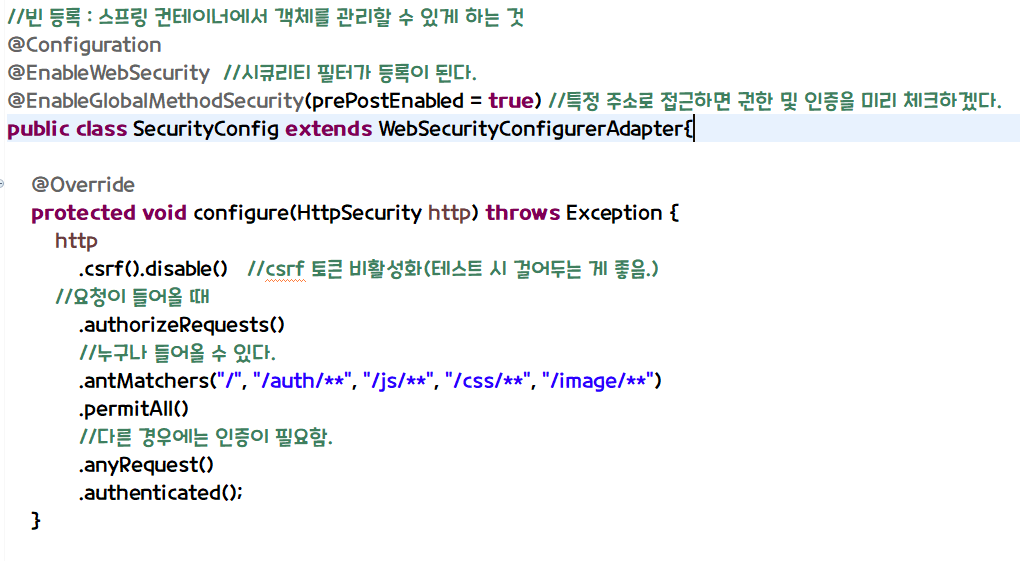 2. 요청이 들어왔을 때 인증이 필요한지, 필요하지 않은지 구분하는 시큐리티 필터를 등록하는 SecurityConfig 클래스 생성