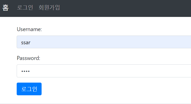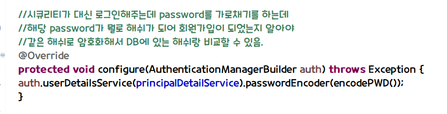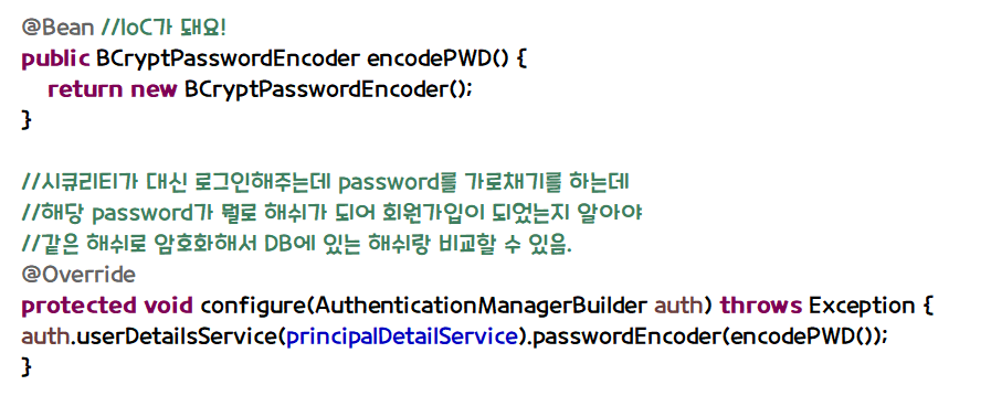 - 스프링이 로그인 요청을 가로챌 때 username, password 변수 2개를 가로채는데 password부분 처리는 알아서함.