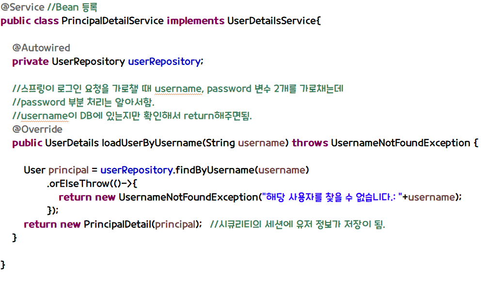 - 그 다음 PrincipalDetailService가 갖고 있는 메서드에서 username이 있는지 비교 후 new PrincipalDetail(principal)를 리턴함.